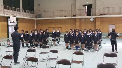5年生が卒業式の練習をしています。6年生への感謝の言葉が体育館中に響いていました。