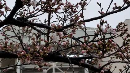 うさぎ小屋横の桜です。花が咲き始めました。つぼみもさわるとはじけそうです。