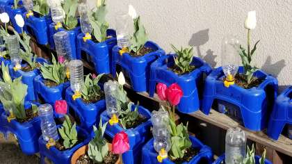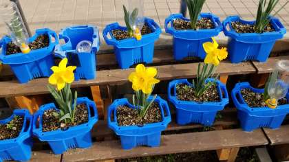 子どもたちの育てた水仙とチューリップの花がきれいに咲いています。