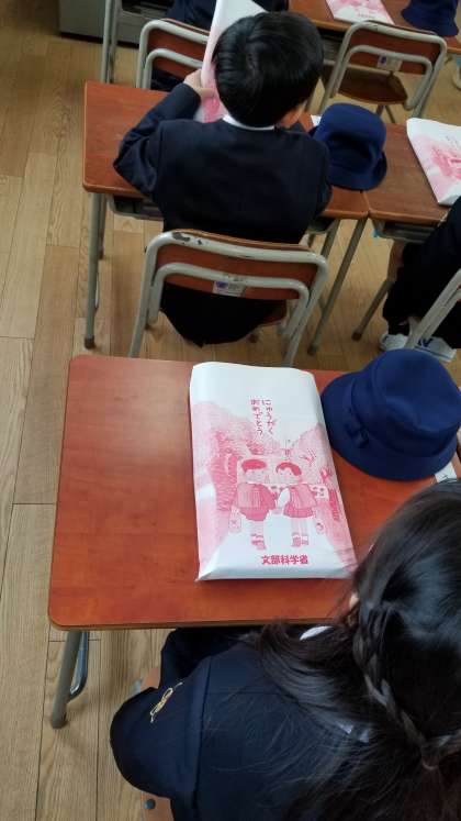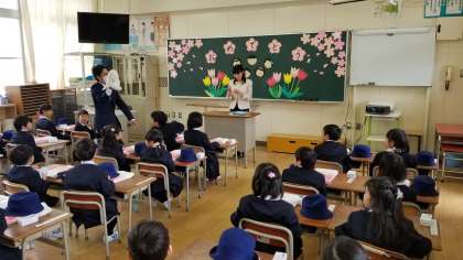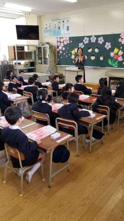 入学式が終了して、教室で担任の先生からお話を聞いています。