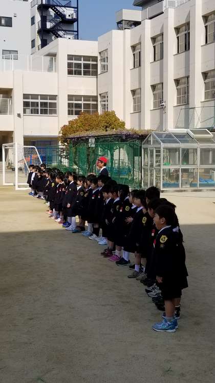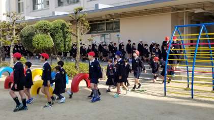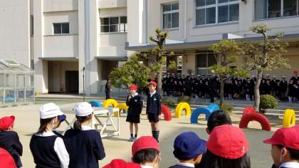 6年生が手をひいて全校児童の前に1年生が並びます。