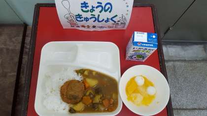 今日の献立は、カツカレーライス・フルーツ白玉・牛乳です。今日は入学お祝い献立でした。