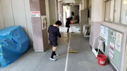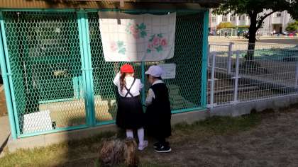 1年生が「うさぎ、かわいいから見に来た」とふれあっています。