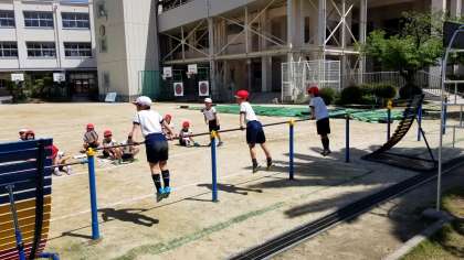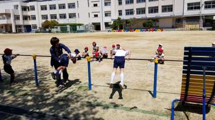 鉄棒をしています。うたに合わせて練習していました。
