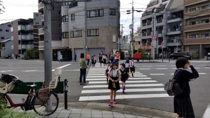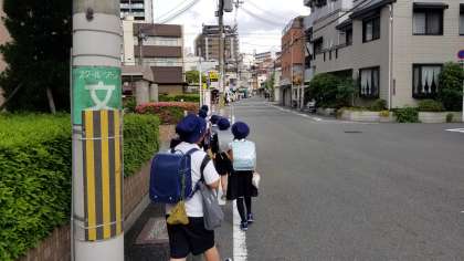 登校班のリーダーがしっかりとみんなをまとめて登校しています。
