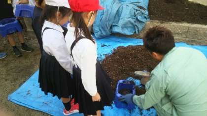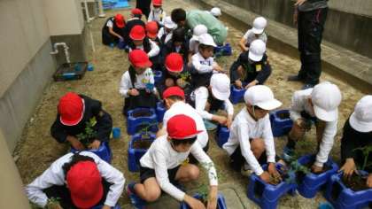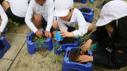 2年生が、ミニトマトを植木鉢に植えました。ミニトマトは、生活科の学習で1学期中、世話をして、観察記録をします。赤い大きな実がいっぱいなるといいですね。