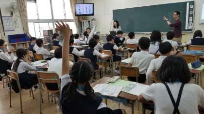 6年1組の英語活動の様子です。「play baseball や do judo などスポーツによってplayやdoが違うのはなぜですか」というような質問が出るなど、みんな積極的に授業に参加していました。