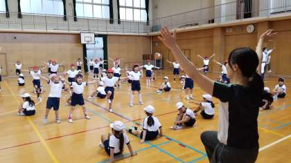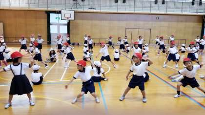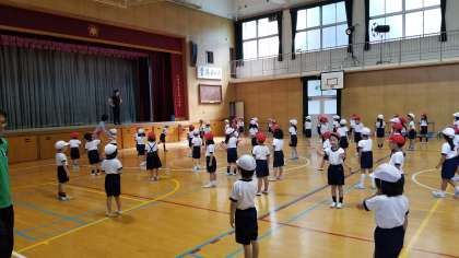 1・2年生の授業の様子です。運動会の団体演技の練習をしています。