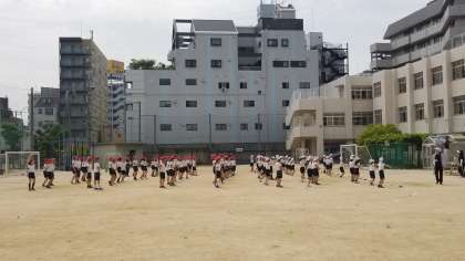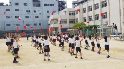 3・4年生の授業の様子です。運動場で運動会の練習をしています。担当の先生にほめられたり叱られたりしながら少しずつ発表演技が完成していきます。