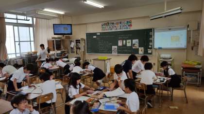 3年生は、社会と道徳の授業でした。1組は協力してパンフレットを作製し、2組は静かに先生の話を聞いていました。