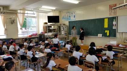 上の写真は、1年1組のホームルームの様子です。新しいお友だちの紹介をしています。