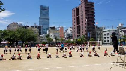 下の写真は、1・2年生の運動会の練習の様子です。運動場での練習がはじまりました。