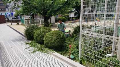 管理作業員の阪口先生が植木の剪定をしています。今年から管理作業員さんは一人になりました。計画的に作業をすすめています。