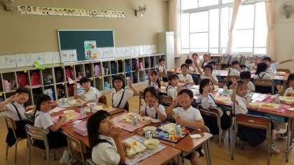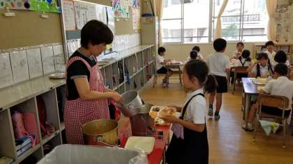 2年生の給食の様子です。担任の先生が上手く量の調整をしています。