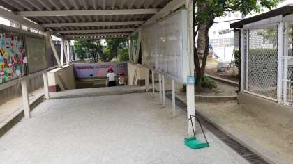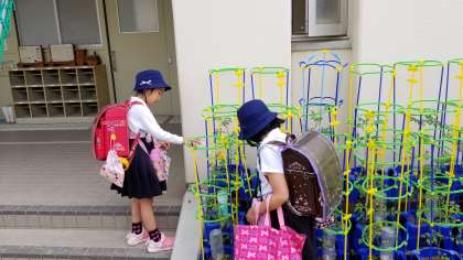 1・2年の児童がミニトマトや朝顔に水やりをしています。