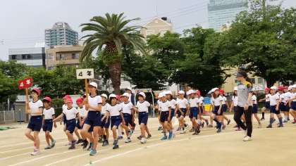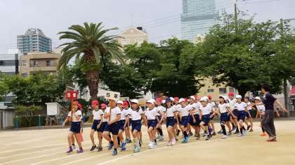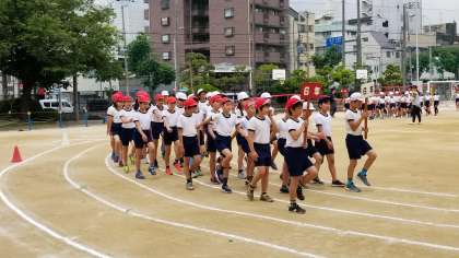 国旗・校旗、優勝旗に続いて6年・5年・4年の入場です。