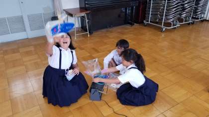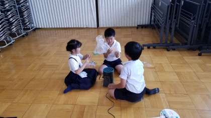 3年1組の図工の様子です。風を受けて作品が舞い上がると、「わー」という歓声がたくさん聞こえてきました。