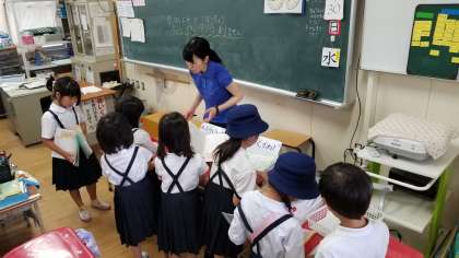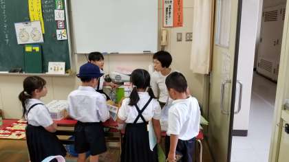 1年生の様子です。提出物の確認をしているのでしょうか。児童たちも手伝っています。