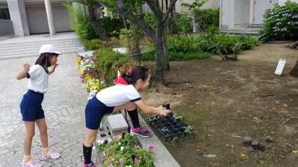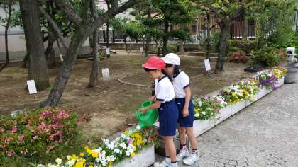 朝の様子です。4年生児童がへちまとひょうたん、なかよしの花に水やりをしています。