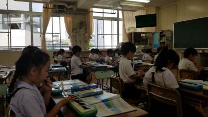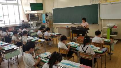 2年1組の音楽の様子です。担任の先生のオルガンにあわせて鍵盤ハーモニカを演奏しています。早くなったり遅くなったりしっかり先生のオルガンの音を聴いて演奏できていました。