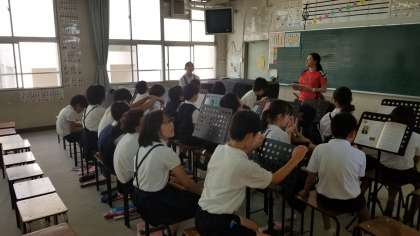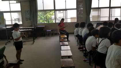 6年2組の音楽の様子です。リコーダーのテストをしていました。課題曲を演奏してみんなが評価します。緊張しながらも最後まで演奏していました。みんなもしっかりと演奏を聴いて「高音のところがすごくきれいだった」などと意見を発表していました。