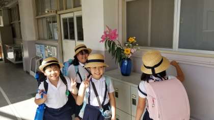 1年から3年生は5時間目で終了です。3年生が校長室の前の花をみてお話をしていました。気をつけて帰ってください。そして、月曜日元気に登校してください。