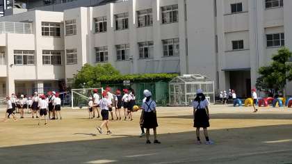 朝の様子です。天気も良く運動場で元気に遊んでいます。
