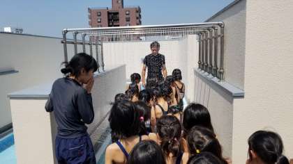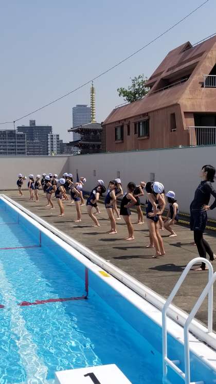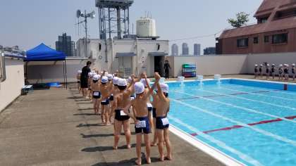 1年生のプール開きです。初めてのプール学習です。担当の先生から細かな注意がありました。常にお友だちを意識させるバディペアの確認から授業がスタートしました。
