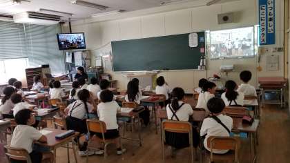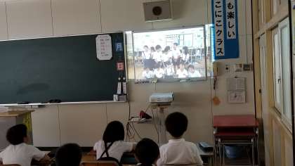 4年1組の授業の様子です。天フェスの宣伝ビデオを作成してみんなで鑑賞しています。楽しいお店になるようにみんなで頑張っています。