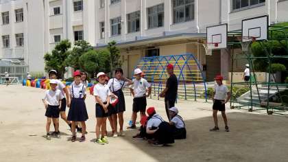 休み時間の様子です。担任の先生も赤白棒をかぶって遊びに参加しています。