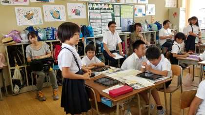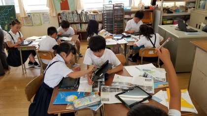 3年1組の公開授業の様子です。社会科で「大阪市のようすと人びとのくらし」について学習しました。タブレットを活用して調べたことをまとめたり、地図を作製したりしました。最後にしっかりとまとめたことを発表できました。