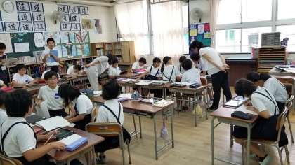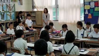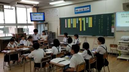 5年1組の国語の公開授業の様子です。単元は「ICTを使って討論会をしよう」です。インターネットから資料を選択して、自分たちの主張する意見の根拠として活用したり、発表ノートに資料を提示したりして討論を進めていました。