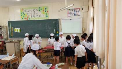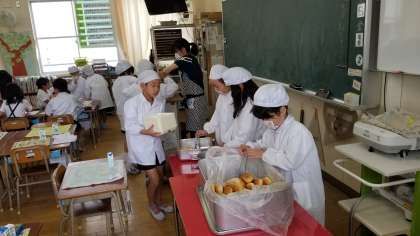 3年生の給食の様子です。子どもたちで配膳をしています。