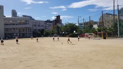 楽しそうにサッカーをしています。今日は最高気温33度の予報です。今後の気温によっては、休み時間は教室ですごさせるなど熱中症に注意をして子どもたちを見守りたいとおもいます。