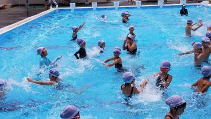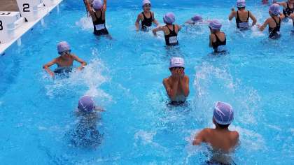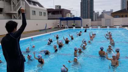 3年生のプールの様子です。ハンドサインで指示を出しています。「グー」は静かにして指揮している先生を見るサインです。できなければ警告が与えられます。