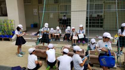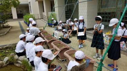 4年2組の理科の授業の様子です。へちま・ひょうたんの成長の様子を観察しています。しっかりと学習しています。