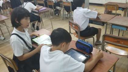 5年生の朝の様子です。1組は読書やタブレットで問題演習をしたりしています。2組は図工の準備をしていました。