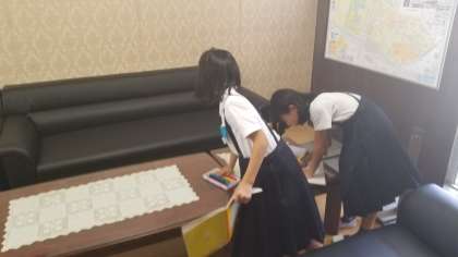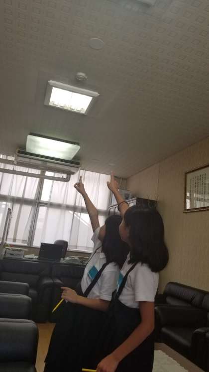 4年生が社会科の授業で「防災」について学習しています。学校の中にある防災器具、消火器具などを調べています。校長室にも調査にきてくれました。