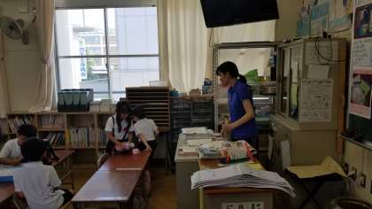 担任の先生は朝からやることがいっぱいです。よごしてしまったハンカチを洗って乾かしたり、提出物の確認など少しでも時間を見つけて仕事をしています。