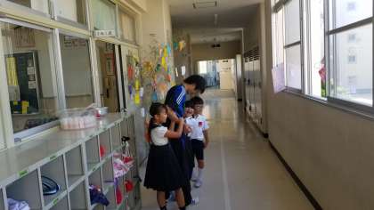 1年生の朝の様子です。「先生、この絵の動物わかる」「これぼくが描いた」などいろいろな質問やお話をしてくれます。廊下では教育支援員の先生と楽しそうに遊んでいます。