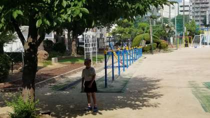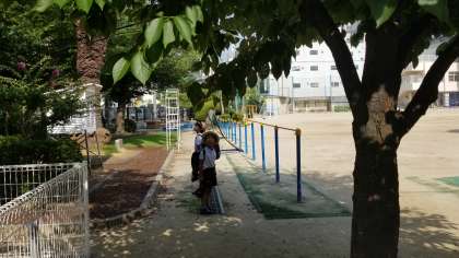 ビオトープの桜の木の下で、子どもたちが蝉を見つけて遊んでいます。