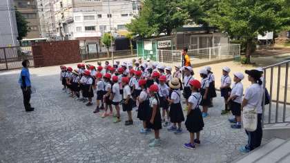1年生が「校区たんけん」に出発しました。たんけんする場所は稲生公園です。