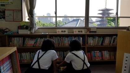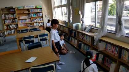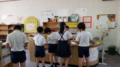 朝の様子です。5・6年生が図書館で本を選んでいます。
