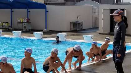 気温が高く、プールサイドの指導を短くして指導しています。また、複数教員が体制を組んで指導しています。