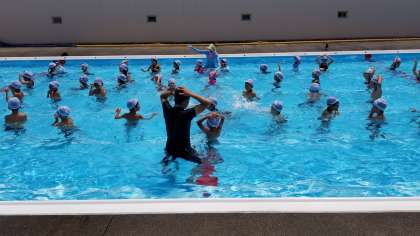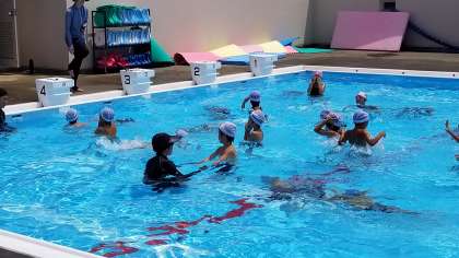 低学年は水に慣れることから始まります。先生もプールの中に入って一緒に手を取って指導します。