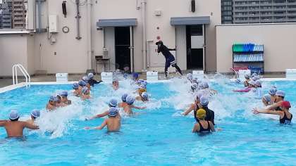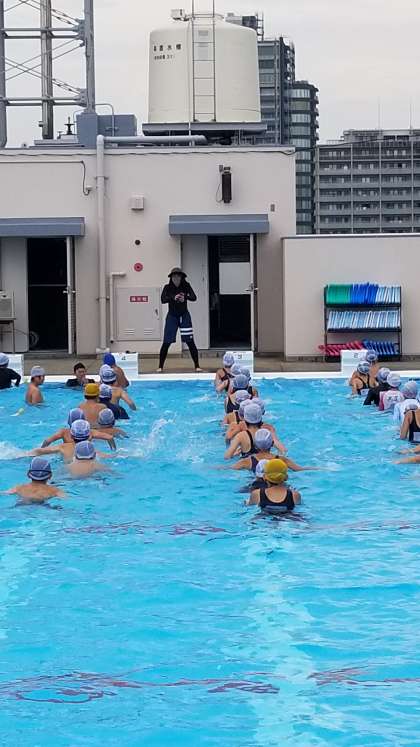 5年生の水泳の様子です。プール全体を使って指導します。少し雨が降りましたが水温は高くみんな気持ちよさそうです。