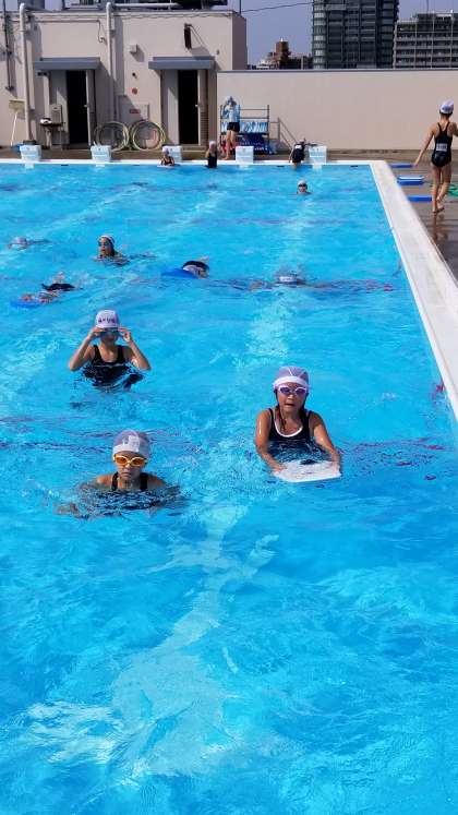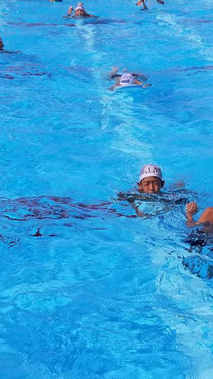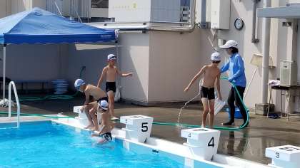 4年生の水泳の様子です。プールサイドが熱く、先生が水を撒いてくれています。4年生は音楽に合わせれ25mをどんどん泳いでいました。