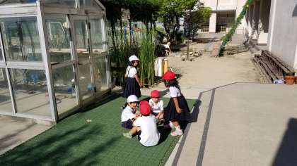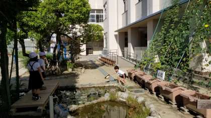 朝の様子です。蝉からトンボにバトンタッチされたようですね。子どもたちがザリガニ池周辺でトンボを追いかけています。