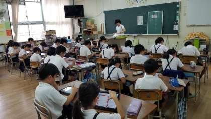 4年2組の朝の学習活動の様子です。タブレットを使って「やるKey」で算数の演習問題を行っています。