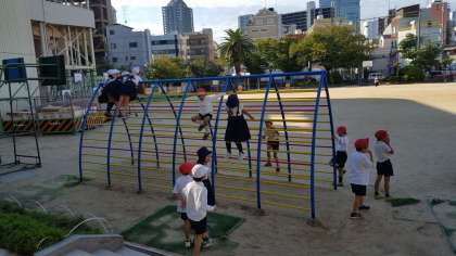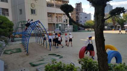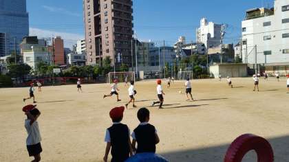 いつもより広い運動場の様子です。運動場を大きく使って運動しています。